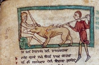Ormesby Psalter: ms. Douce 366, fol. 55v: det.: border: Unicorn and hunter. c.1310-25. Bodleian Library.